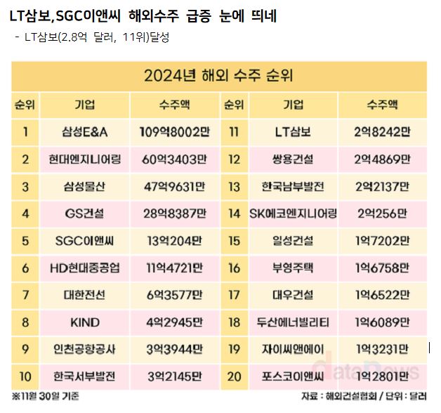 LT삼보는 지난해 해외 수주액 880만 달러에서 올해 2억8242만 달러로 급증하며 해외 수주 순위 11위에 올랐다.